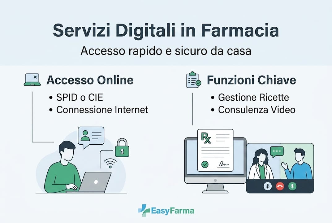 | Requisiti di accesso | Basta una connessione, eventuale SPID per ricette e scelta di una farmacia autorizzata per iniziare la consulenza online. |