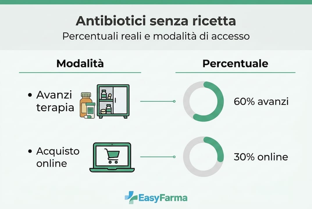 Le modalità di accesso agli antibiotici senza ricetta sono principalmente due. La prima, e più comune, è l'utilizzo di avanzi di precedenti terapie: circa il 60% di chi si automedica usa farmaci rimasti in casa da cure precedenti. La seconda è l'acquisto online, pratica in crescita che espone a rischi aggiuntivi legati alla qualità e all'autenticità dei prodotti.